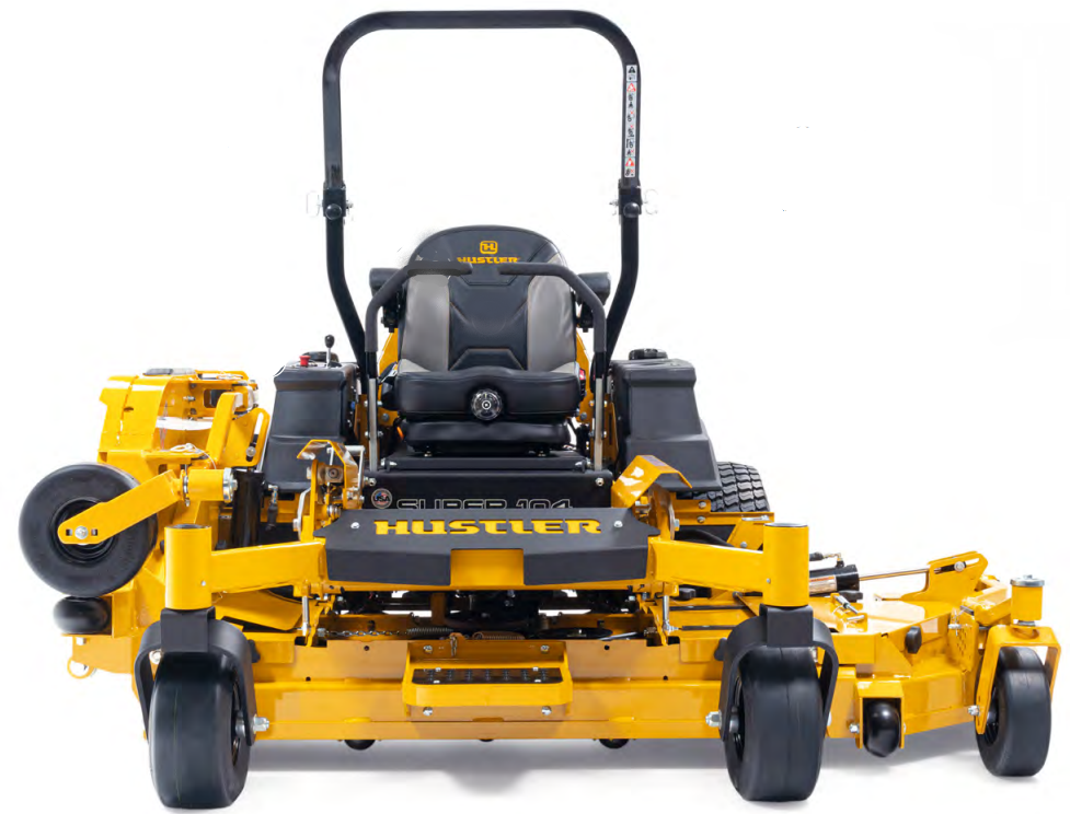 Hustler Super 104 klipper hele 264 cm (104”) med 5 rotorknive og effektivt bagudkast. Den har den nye Kawasaki FX1000 EFI motor med Electronic Fuel Injection, som giver den hele 38,8,5 hk og en bedre brændstoføkonomi. Højdereguleringen og op-klap til transportstilling foregår hydraulisk, blot ved at trykke på en knap. Til de helt store arealer, findes der ikke en bedre løsning. Priser fra 259.996,- excl. moms