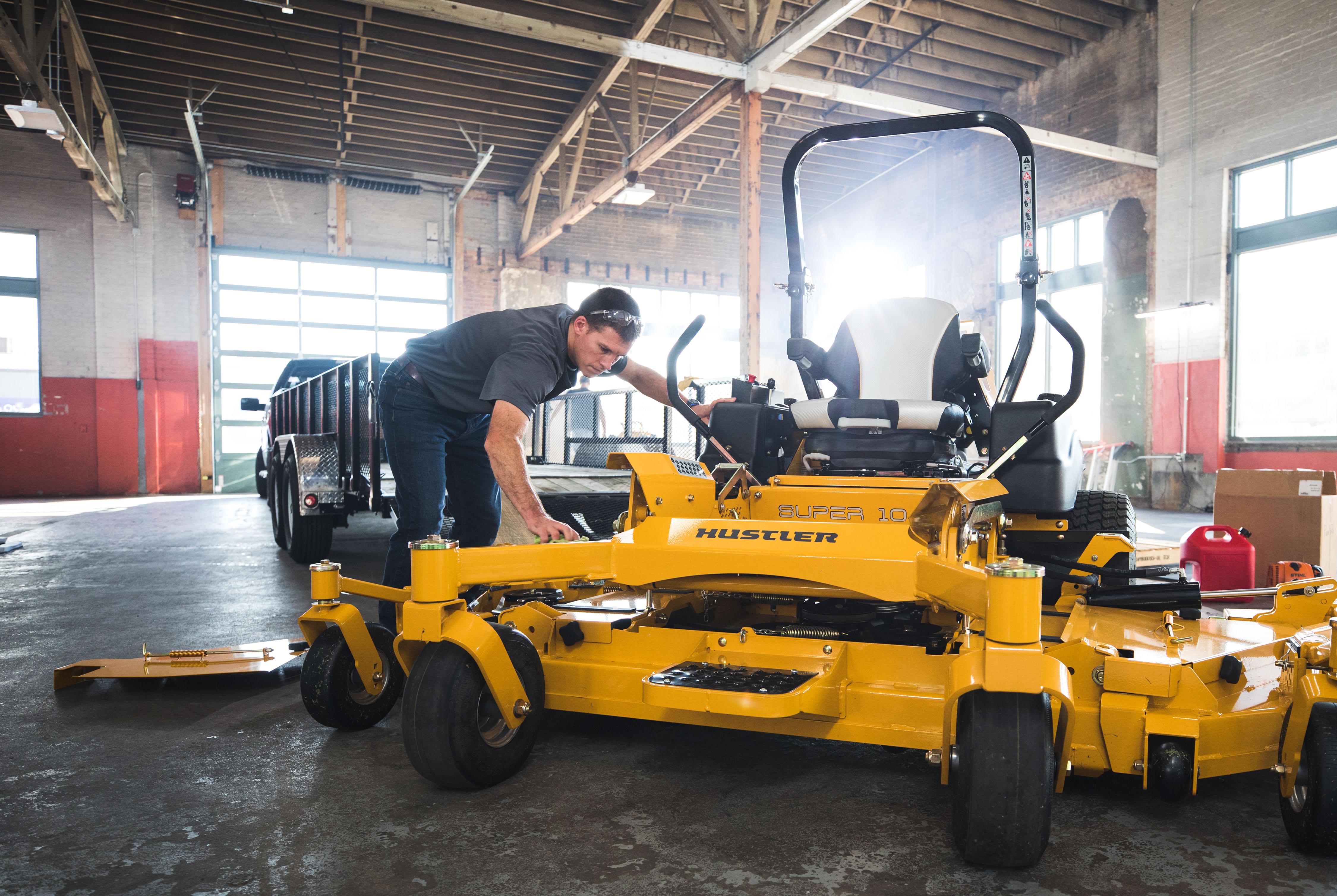 Han har tidligere haft forskellige robot-løsninger, men nu er det en Hustler Super 104, der løser opgaven.